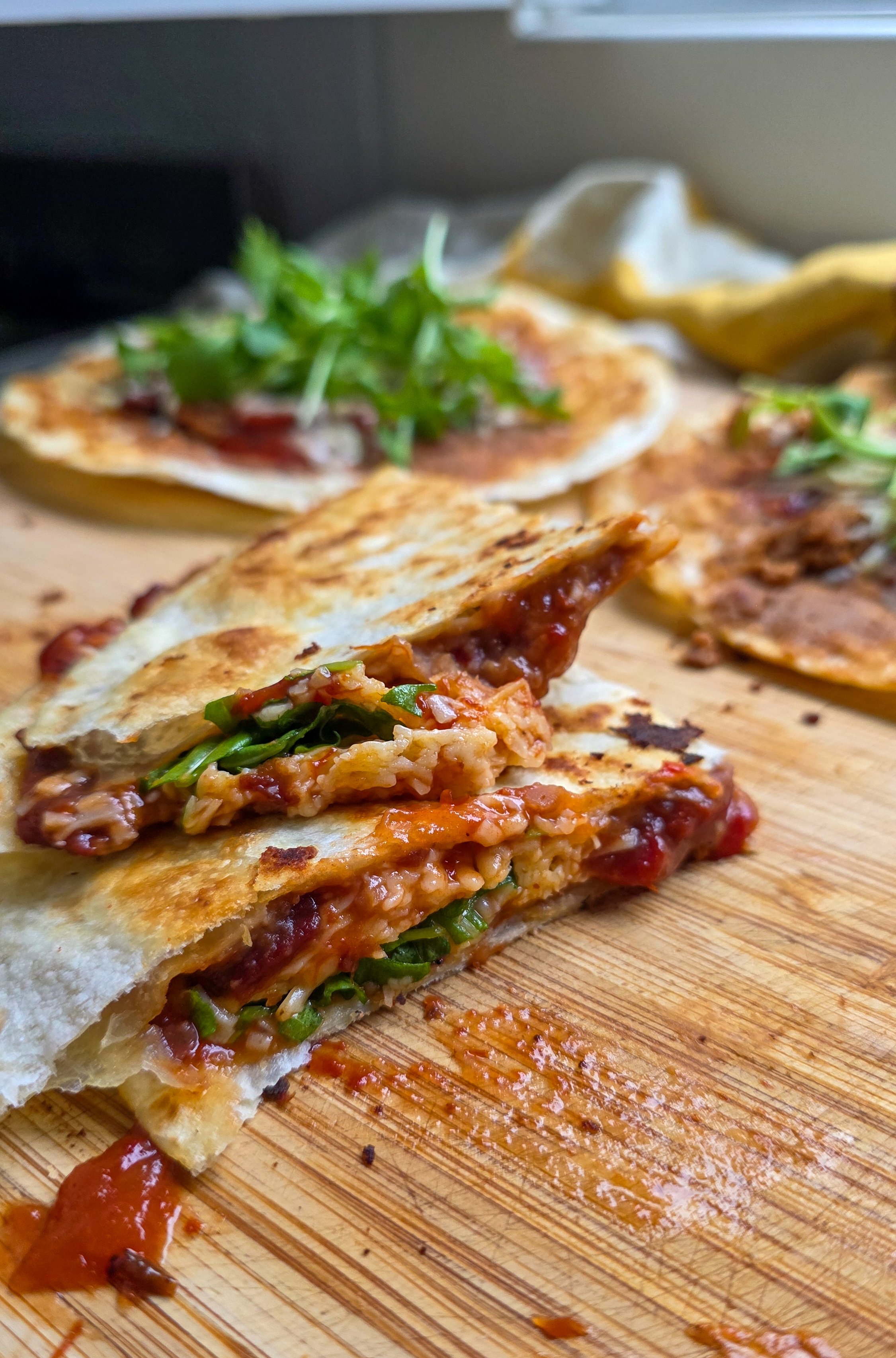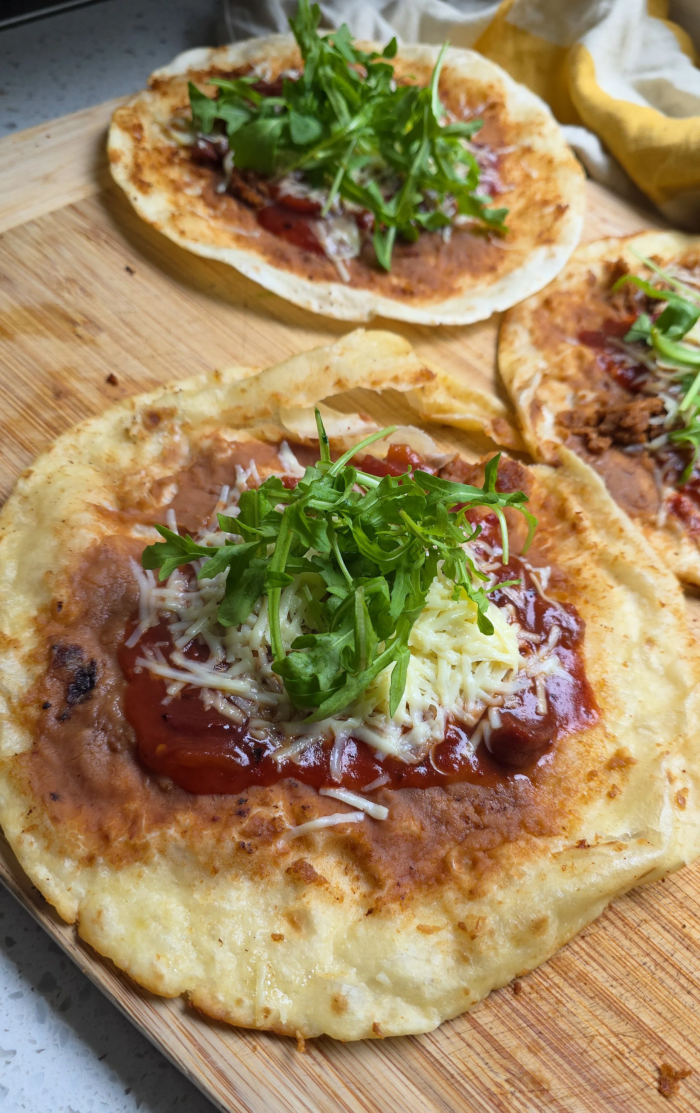 Remove the taco wrap from the pan. Top the taco wrap with a handful of fresh rocket.