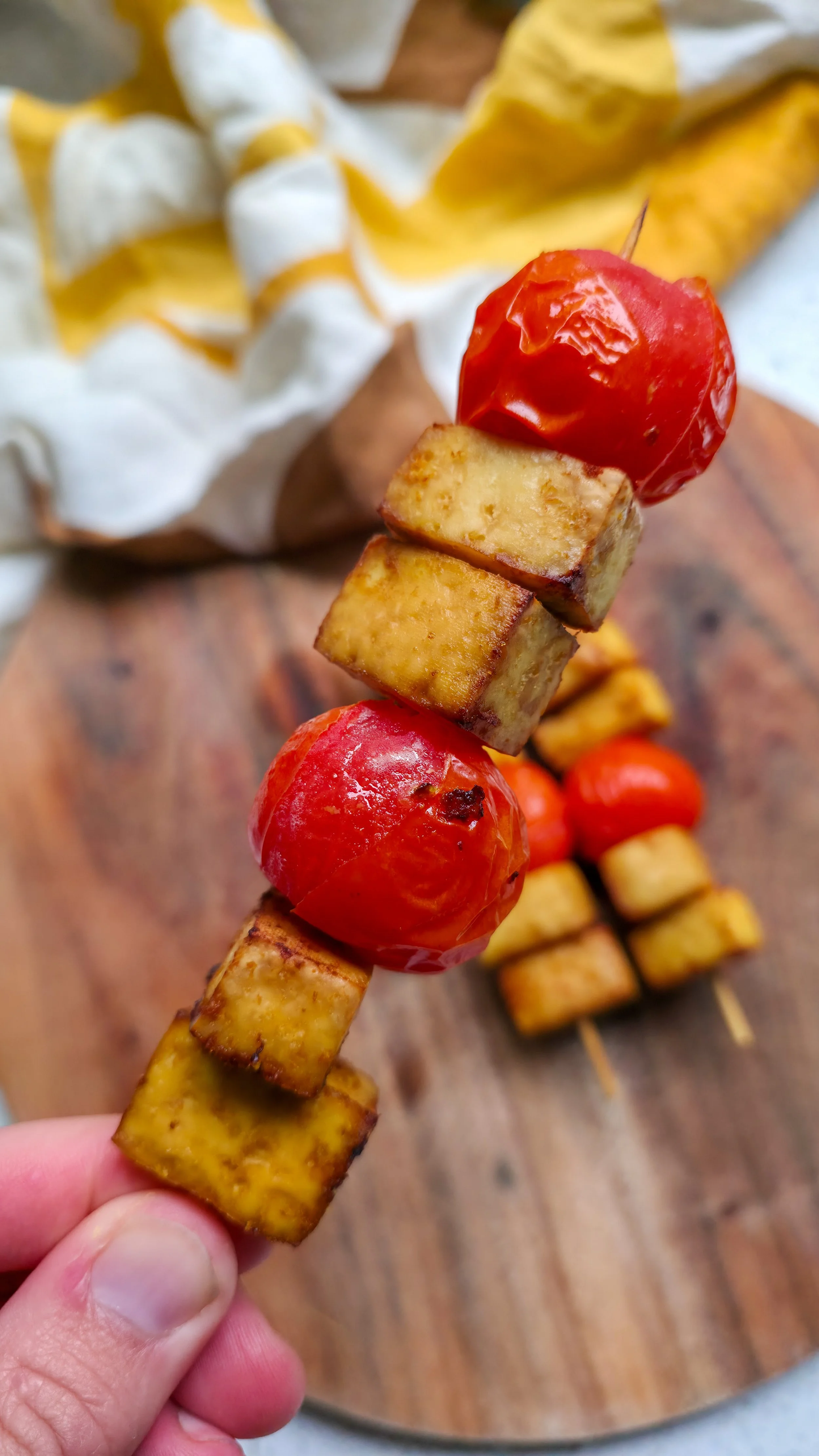 Return the skewers to the air fryer and cook for another 6–8 minutes at 170°C until the tomatoes are just blistered and tofu is golden.